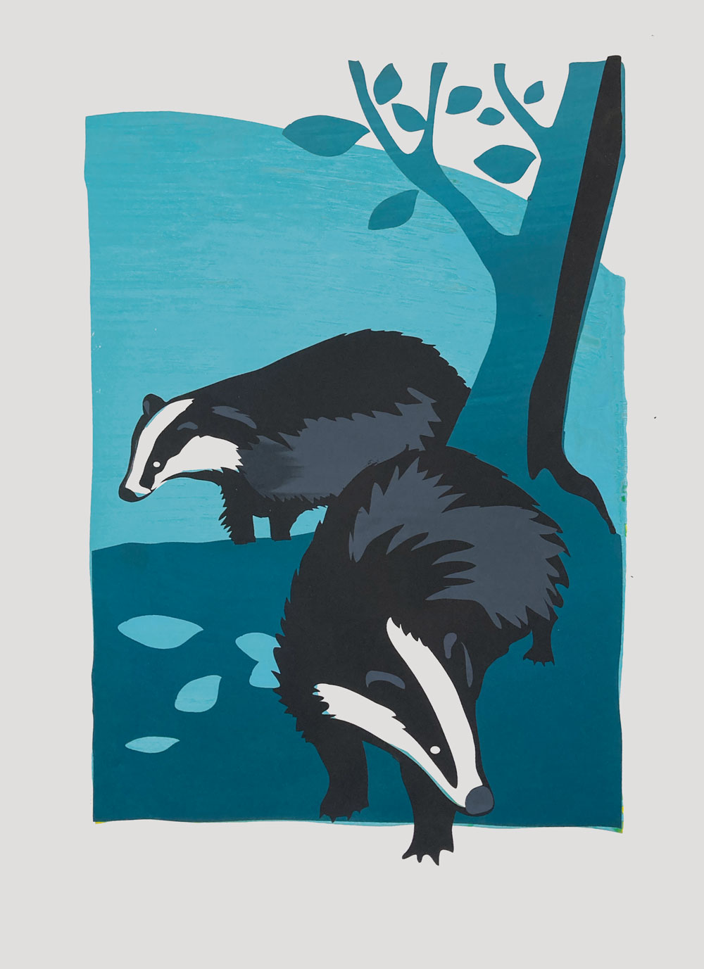 Door de drukte van alledag schoot het zeefdrukken er afgelopen jaar een beetje bij in. Toen kreeg ik een tip: maak het niet te ingewikkeld, begin met iets eenvoudigs, ga gewoon aan de slag met drukken. Die tip heb ik ter harte genomen en ik maakte op een avond een snel ontwerp van deze dassen, ook weer (zeer losjes) gebaseerd op wildcamerabeelden uit de achtertuin, net als de oudere serie ‘Nachtleven’ hieronder.